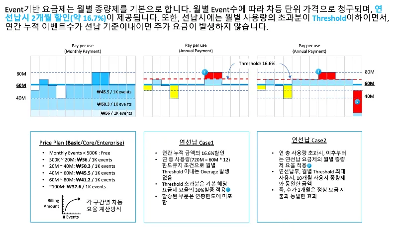 - 무료고객의 경우 사용량 초과시 서비스 접속이 불가능하며, 요금제 업그레이드 이후 사용이 가능해집니다. 로그 수집은 계속됩니다. 다만, 1개월동안 유료 요금제로 업그레이드를 하지 않을 경우, 데이터 수집이 중단되고, 기존 데이터도 모두 삭제됩니다.